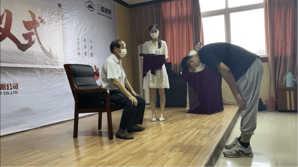 徒弟向師父行拜師禮、敬茶,師傅回贈(zèng)禮品,師徒們從此結(jié)下深厚的師生情誼。